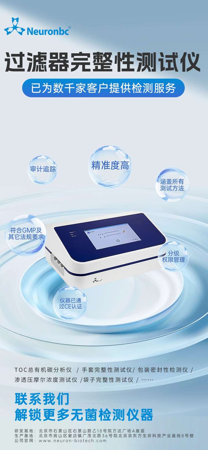 在行业对质量与安全要求不断升级的今天,选择专业、可靠的完整性测试仪,是企业强化质量管控的关键一步。北京钮因(Neuronbc)在无菌检查领域深耕20余年,其研发的过滤器完整性测试仪系列产品,凭借精准的检测算法、人性化的操作界面、完备的数据追溯功能,已经为国内外3000余家制药企业、生物技术公司提供服务。无论是起泡点、扩散流还是水侵入测试,钮因都能提供稳定可靠的解决方案。把合规变成生产力,从选对工具开始——而选对工具,不妨从了解北京钮因开始。